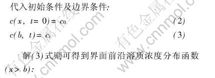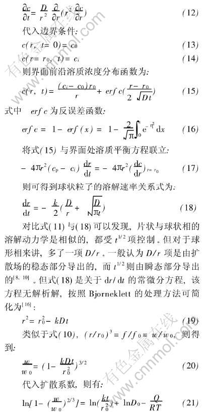 随着溶解过程的进行, Inconel 718合金中针状δ相很快转变为短棒状及颗粒状, 同时在初期也存在缺陷处的优先溶解。 因此, 有理由以球形粒子的三维模型来描述δ相后续的溶解过程。 对于固溶体中一个半径为r0的球形粒子的各向同性溶解, 其浓度变化关系为: