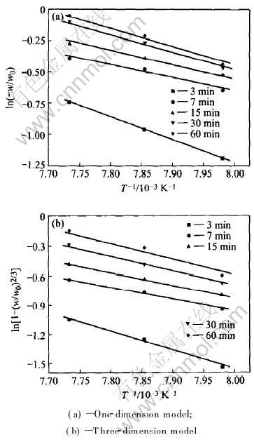 由溶解过程中δ相的组织演变可知, 在整个溶解过程中, δ相主要表现短棒状及颗粒状。 因此, 如果δ相溶解动力学过程的控制环节为扩散过程, 则可由公式(11)及(21)通过线性拟合得到控制δ相溶解的表观激活能, 拟合结果如图5所示。