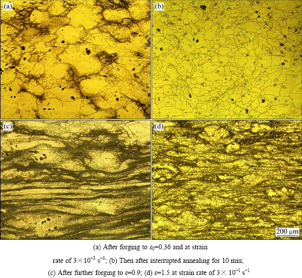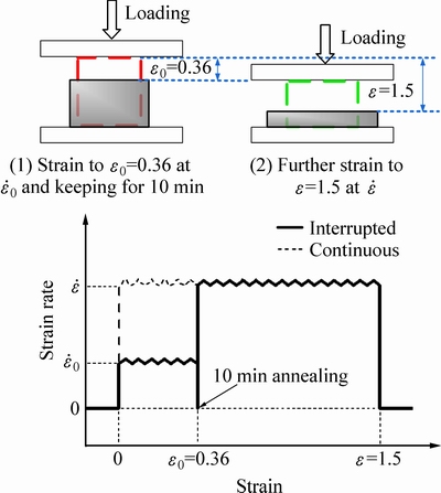 = 3×10-3 s-1的低应变速率下将样品锻压至ε0=0.36,保温10 min后再以3×10-1 s-1的高应变速率锻压至ε=1.5。同时另一样品则直接在3×10-1 s-1下一步锻压至ε=1.5,以作参照。锻压实验在具有保温功能的压机(WDW-100A型)上进行。锻压样品规格为10 mm×10 mm×10 mm。锻压前,在模具上涂上石墨作为高温润滑剂,在炉温达到设定温度后,再将样品放入炉内静置10 min让其热透,然后开始锻压。锻后5 s之内迅速将样品取出水淬。