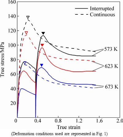 Table 1 Effects of interrupted forging on peak and steady-state value of flow stresses (Peak value involved under interrupted forging is value of second peak forged at high rate, marked by solid triangles in Fig. 2)
