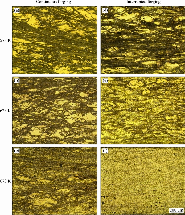 Fig. 3 Microstructures of alloys developed at ε=1.5 during continuous and interrupted forging under various temperatures from 573 K to 673 K