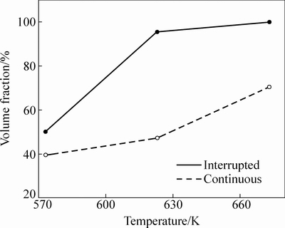 图4所示为不同温度下两种工艺锻后组织再结晶体积分数对比图。由图4可见,随着变形温度的升高,锻后组织的再结晶体积分数都有不同程度的增大。分步锻压后的再结晶体积分数(实线)随温度的上升幅度要明显高于一步锻压(虚线),二者在623 K和673 K条件下的差距最明显,其中623 K下分步锻后的再结晶体积分数已经达到95%,而一步锻后的再结晶体积分数只有47%。结合图3和4可以得出,分步锻压对AZ91镁合金再结晶的促进作用更大,这种现象在623 K时最为明显。这与分步锻压工艺对流变应力的影响规律基本相符(见图3),即在623 K时可最大程度地降低变形过程中的峰值应力和稳态应力。