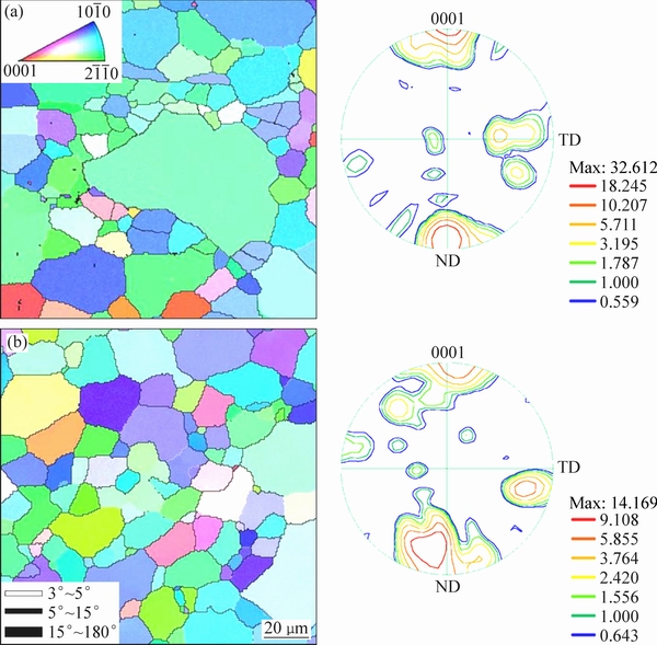 Fig. 7 Typical IPF maps and corresponding {0001} pole figure developed at ε=1.5 after continuous (a) and interrupted forging (b) at 623 K