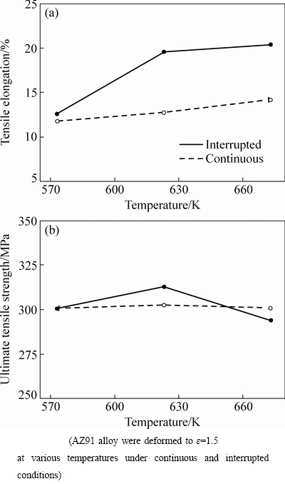 Fig. 8 Changes in tensile elongation to fracture (a) and ultimate tensile strength (b) at room temperature as function of deformation temperature
