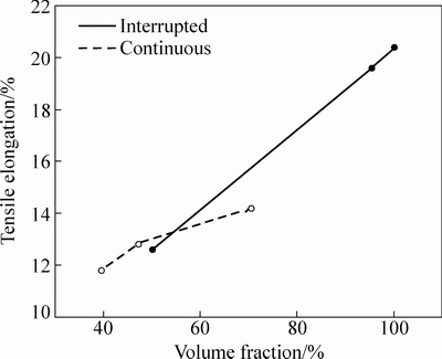 图9 不同锻压工艺变形后样品室温伸长率与再结晶体积分数之间的关系