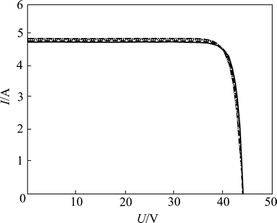 为太阳能模块的输出特性函数,给定温度为25°;S为光照强度;t为温度。计算和比较每个粒子的适应值,对粒子速度进行更新。式(8)为单个模块的电压电流公式,通过计算得到输出功率。