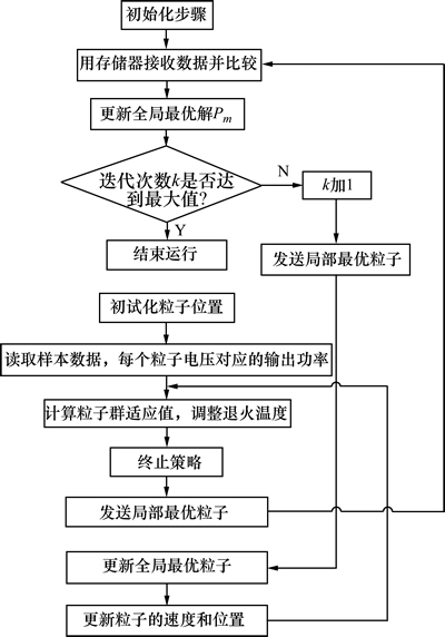 本文提出的是在局部阴影情况下的MPPT算法,因而目标函数应为全局功率,变量为光伏板的输出电压。在使用PSO优化时,粒子的位置应定义为阵列电压,在粒子进行迭代的同时计算适值函数值,以调整退火温度,提高计算速度。