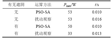 分别在无遮阴情况和有遮阴情况下,运用模拟退火-粒子群算法以及传统的扰动观察法进行仿真,对所得到的结果进行对比。经过仿真,所得不同条件下的最大功率如表1所示。