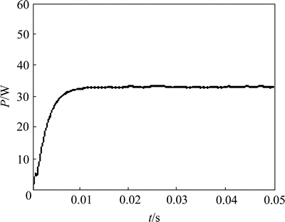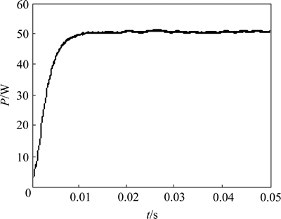 从图 9可以看出:采用新型算法时,最大功率在50 W左右波动,在0.01 s时攀升至最大功率输出。从图10可以看出:采用扰动观察法时,在0.013 s时攀升至最大功率输出,也就是在第1个极值点,但输出只有33 W左右。而实际情况中光伏列阵的全局最大功率点不一定在第1个极值点,因而,采用本文提出的算法更符合实际。
