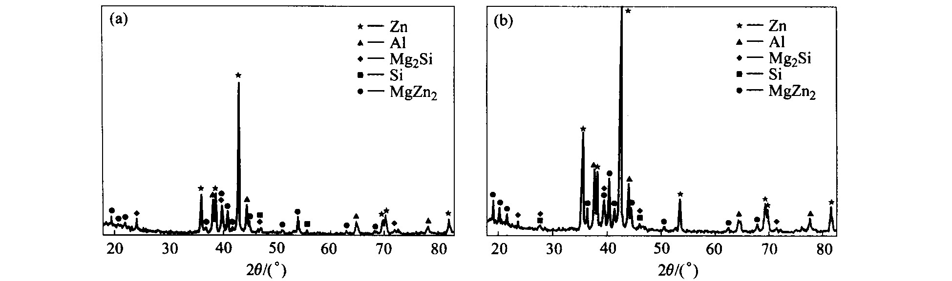 图3 (Mg2Si+Si)/Zn基复合材料的X射线衍射谱 Fig.3 XRD patterns of (Mg2Si+Si)/ZA27 matrix composites (a)—Inner layer; (b)—Outer layer