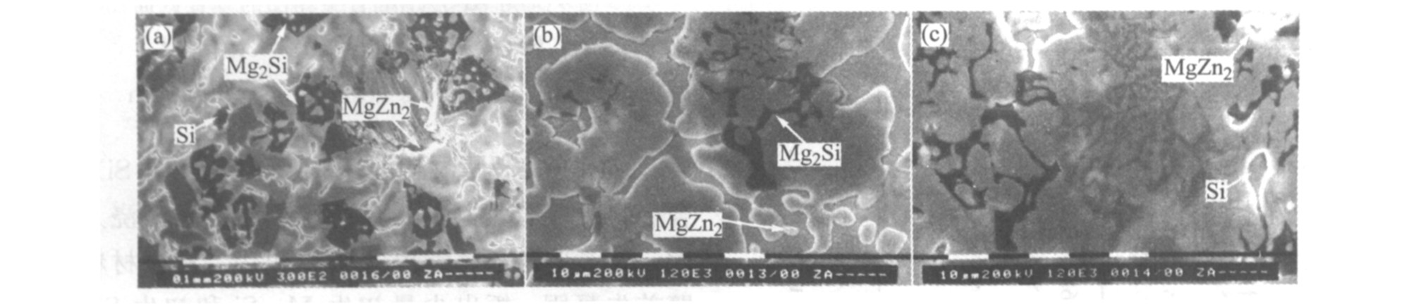 的摩尔比为2, 可以判定其为MgZn2 相, 经测定图4(b)中外层的白亮条状相也为MgZn2 , 而深灰色的条状相为Mg2 Si。 外层(见图4(c))浅灰色杆状相的能谱分析(见图5(d))表明该相为Si。
