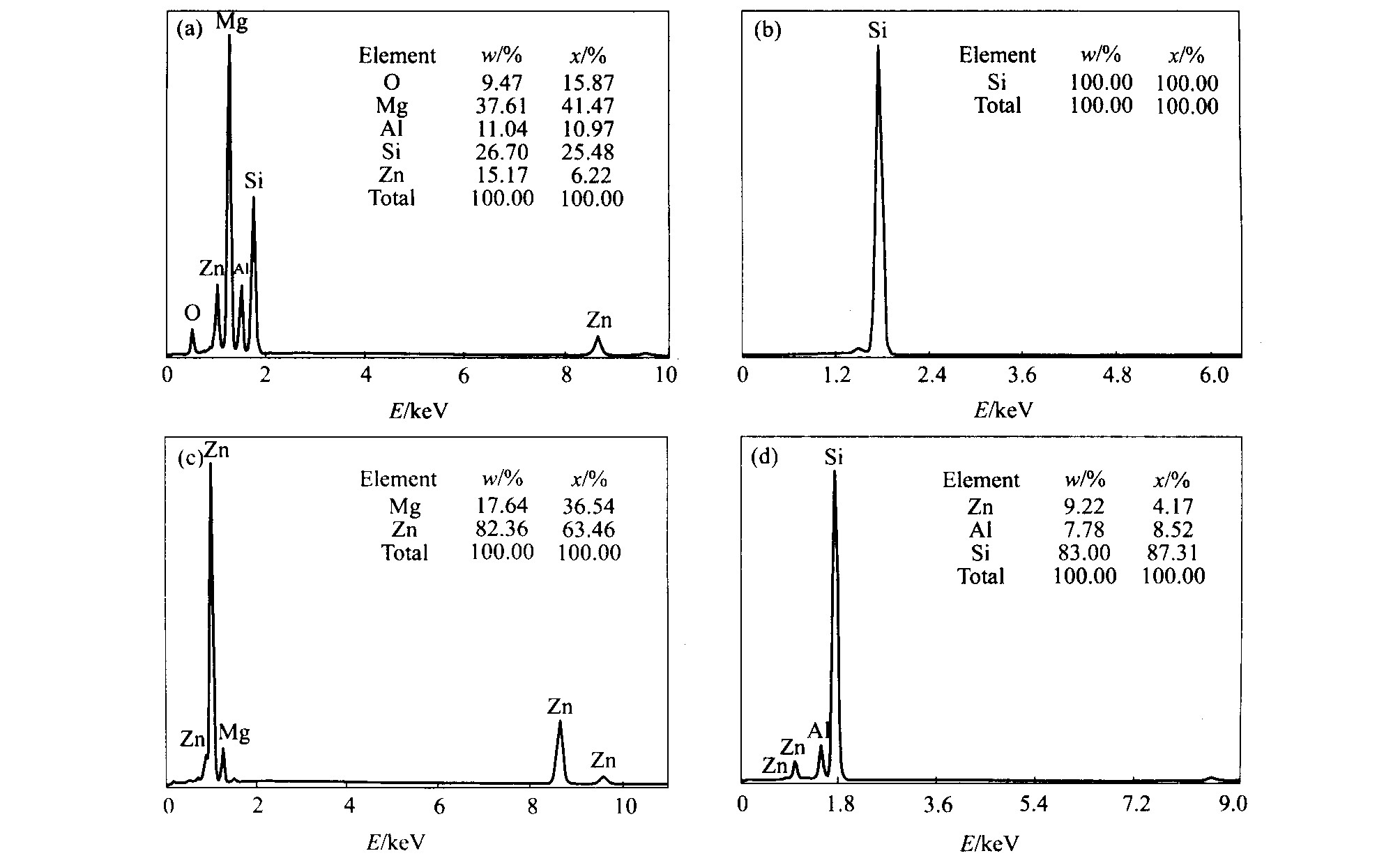 图5 (Mg2Si+Si)/Zn基复合材料的能谱分析 Fig.5 EDAX spectrum of (Mg2Si+Si)/Zn matrix composite (a), (b), (c)—Inner layer; (d)—Outer layer