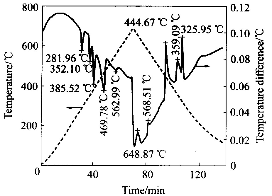 图6 Zn-27Al-6.3Mg-3.7Si合金的热分析曲线 Fig.6 DTA curves of Zn-2.7Al-6.3Mg-3.7Si alloy