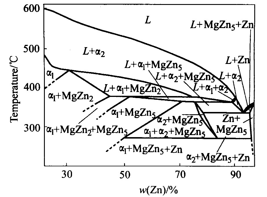 图7 Zn-Al-3%Mg合金相图的垂直截面图 Fig.7 Vertical projection of Zn-Al-3%Mg alloy phase diagram
