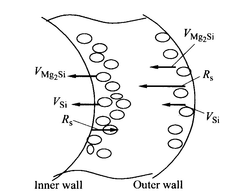 图8所示为离心力场作用下(Mg2 Si+Si)/锌基合金自生复合材料的形成过程。 当金属液浇入管模后, 由于受到金属管模的激冷作用, 复合材料的外壁首先凝固, 析出少量初生Mg2 Si和初生Si, 这2种初生相的密度都远小于合金液的密度。 在最外层, 由于Mg2 Si和Si的内浮速度(V Si , V Mg2 Si )小于凝固速度(R s ), 结果少量初生Mg2 Si和初生Si被俘获而滞留于外层。 由于外层的凝固速度较快, 初生Mg2 Si和初生Si来不及长大, 因而尺寸较小。 随合金液温度的降低, 合金液中不断有Mg2 Si和Si析出, 并在离心力的作用下向内层运动, 合金液凝固层由外向内推进。 另一方面, 由于管模内空气的冷却作用, 复合材料的内层也开始以较慢的速度凝固, 由于内层块状初生Mg2 Si和初生Si的内浮方向与凝固方向相反, 结果大量初生Mg2 Si和初生Si存留于内层, 合金液凝固层由内向外推进。 随凝固
