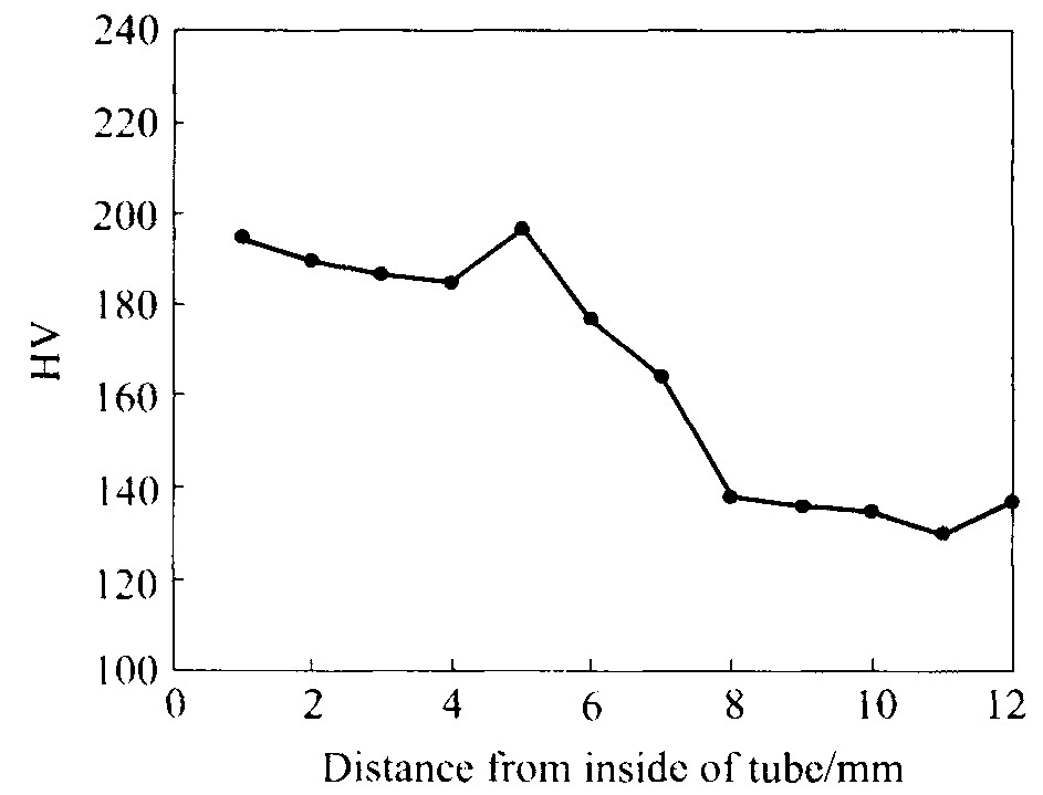 用光学显微镜观察管件横截面的金相组织, 用HV-50型低载荷维氏硬度计测试管壁横截面沿径向的硬度分布, 所用载荷为50 N。 耐磨实验在MPX-2000型销盘式摩擦磨损试验机上进行, 测试干滑动摩擦条件下管件外层、 中层和内层的磨损量, 销形试样的直径为6 mm, 对磨盘为45钢, 硬度为HB177。 滑动速度为0.3 m/s, 垂直载荷为50 N, 摩擦时间为30 min, 试样在磨损前后在酒精中采用超声波清洗并烘干, 用精度为0.1 mg的光电分析天平称量。