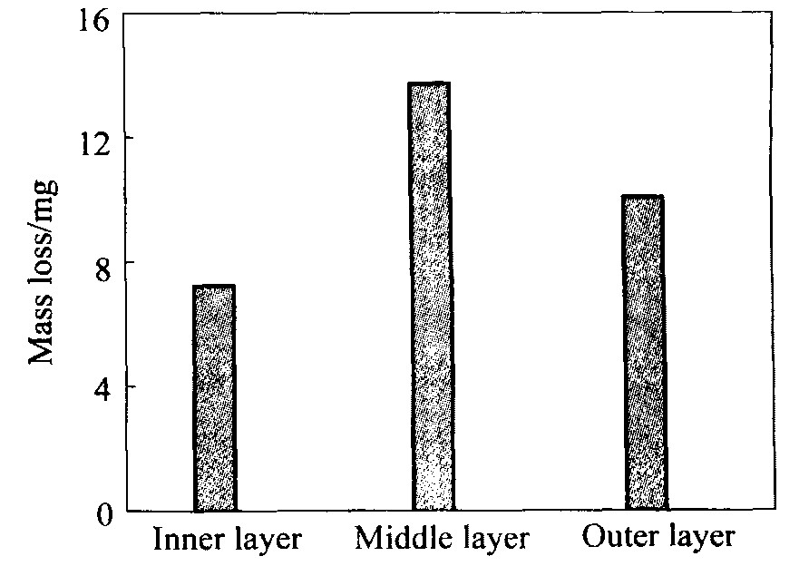 4) 复合材料的耐磨性决定于初生Mg2 Si和初生Si的数量、 形态和分布。 复合材料的耐磨性按中层、 外层、 内层的顺序增加。