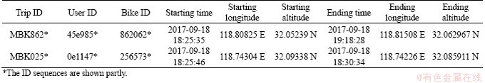Using road network data of Nanjing city, the length data of different levels of road in each traffic zone are calculated by ArcGIS. The mobike travel data come from the mobike company, and the time span of the travel data is from September 18 to 23, 2017. The row data contains the information of trip ID, user ID, bike ID, the starting time and location of each trip, the ending time and location of each trip. After deleting the incomplete and unreasonable trip data (travel distance is larger than 5 km or less than 100 m, and travel duration is less than 30 s or longer than 2 h [43]), there are 2704294 valid samples among six days. The data structure is showed in Table 1.