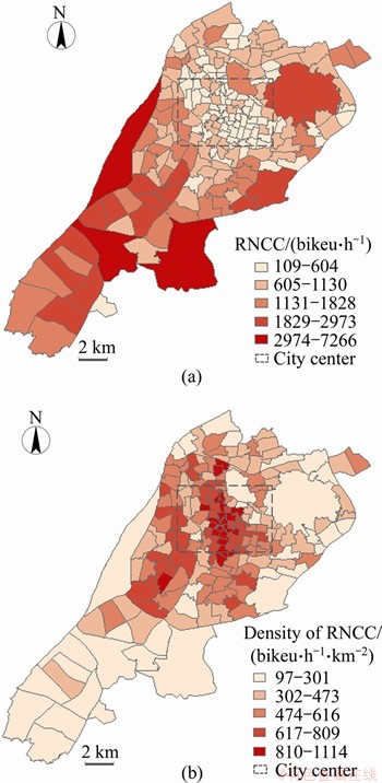 The RNCC of each traffic analysis zone varies from 109 to 7266 bikeu/h, with the average carrying capacity of 930 bikeu/h. According to Figure 2, it can be found that the RNCC increases from the city center to the outer suburbs. The spatial distribution characteristics of its density show opposite changing
