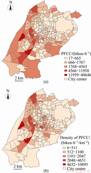 Different from the rule of RNCC, the results showed that the PFCC is generally small in the central area of the city, and the density is also low. The compact land use in the city center and the lack of parking resource lead to the low PFCC density. In contrast, the parking facilities near scenic areas with large land resources have a higher density of PFCC. The PFCC of each traffic analysis zone varies from 17 to 40646 bikeu/h. The highest PFCC density occurs in two parks.