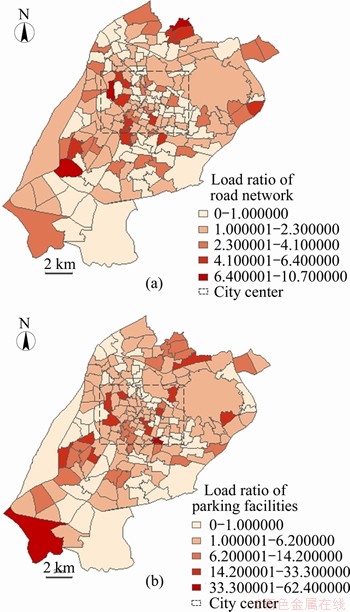 Figure 4 Spatial distribution of load ratio of road network (a) and parking facilities (b)