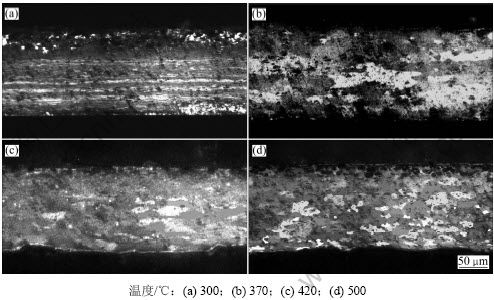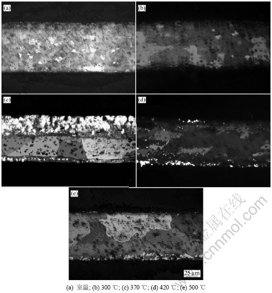 图2所示为中间退火后芯材的晶粒组织。从图2可以看出:在300 ℃退火时,芯部金属未发生再结晶;在370 ℃退火时,部分晶粒发生再结晶;在420 ℃退火时,晶粒全部发生再结晶;当退火温度升高至500 ℃时,晶粒发生粗化。