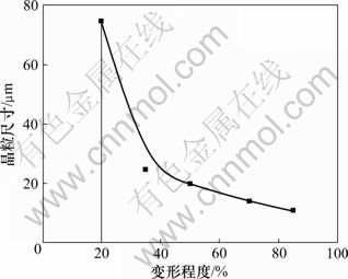 图7所示为变形程度和晶粒尺寸之间的关系。由图7可见:当变形程度达到εc时,晶界大规模迁移发生再结晶,且再结晶晶粒比较粗大,随着变形程度增大,再结晶晶粒不断细化。