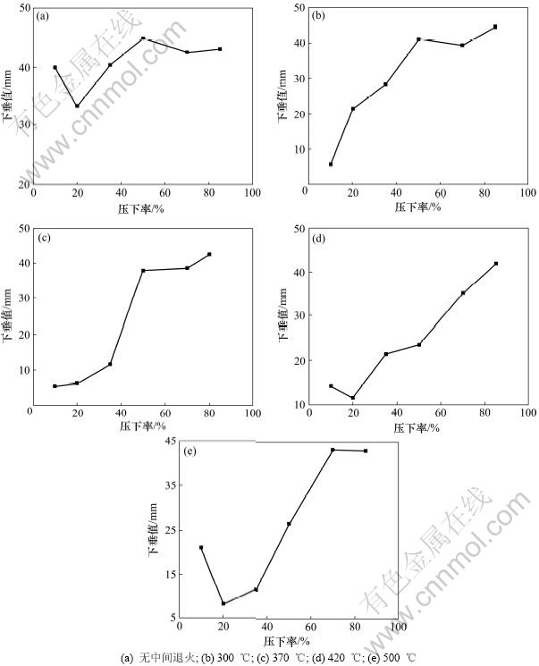 抗下垂实验结果如图8所示。由图8可以看出:无论在何种中间退火制度下,当成品压下率超过50%时,抗下垂性能很差;若不经过中间退火,无论压下率为多少,抗下垂性能都很差。抗下垂性能较好的工艺条件是370 ℃/10%~35%,420 ℃/10%~20%和500 ℃/ 20%~35%。