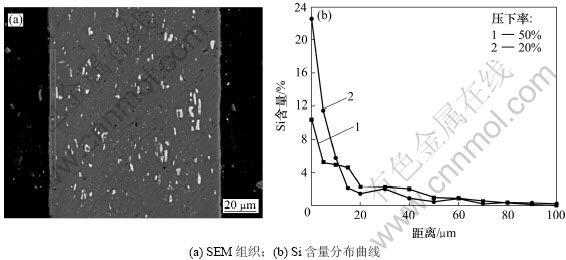 对抗下垂实验后的复合箔截面进行能谱分析,以检测皮材中的Si元素在芯材中的扩散结果。图9所示为420 ℃中间退火、成品压下率分别为20%和50%时,沿铝箔横截面相同面积内Si元素的分布情况。从图9可见:随着到复合箔表面距离的增加,当压下率为20%时,Si元素的含量下降比50%压下率时的快,说明压下率为20%时Si元素的扩散较压下率为50%时的少。