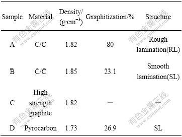 以聚丙烯腈基炭纤维无纬布/炭毡混合叠层针刺毡为增强预制体,采用化学气相渗透技术增密,分别制备出具有粗糙层热解炭(RL)、光滑层热解炭(SL)基体的C/C复合材料。因粗糙层热解炭微观结构好、与石墨类似,热处理后的石墨化度高,故本文作者采用某型号高强石墨作为模拟粗糙层热解炭的固体材料;采用化学气相沉积技术制备了全热解炭试样,经热处理后的金相、XRD检测表明,其石墨化度较低,金相形貌与光滑层热解炭的类似,故可用于模拟光滑层热解炭固体材料。材料部分性能参数如表1所列。