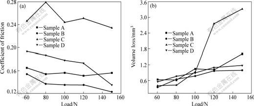 Fig.1 Changing curves of friction coefficient (a) and volume loss (b) with load for samples