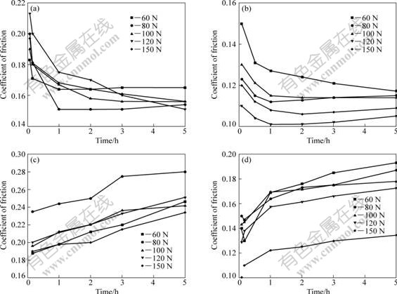 Fig.2 Changing curves of friction coefficient with time for samples A(a), B(b), C(c) and D(d)