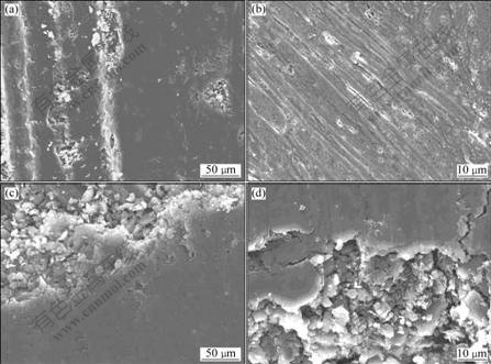Fig.3 Wear surface morphologies of sample A after friction test under 60 N ((a), (b)) and 150 N ((c), (d)) for 5 h