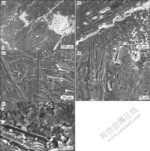 Fig.4 Wear surface morphologies of material B after friction test under 60 N ((a), (b)) and 150 N ((c), (d), (e))