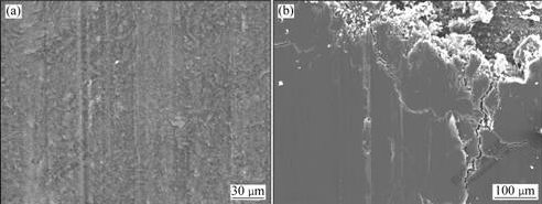 图5所示为材料C在150 N摩擦5 h后的摩擦表面形貌。由图5可见,摩擦膜完整致密,但磨粒磨损严重,能分辨出摩擦膜内粒状的颗粒。而在摩擦膜边缘,形成了较厚的层状摩擦膜堆积形貌,磨屑呈粒状分布,但数量少。