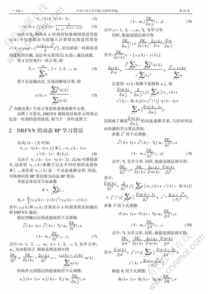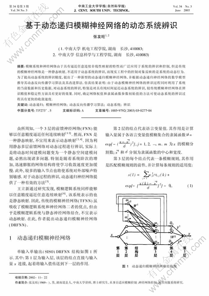 关键词:动态递归;模糊神经网络;动态反向传播学习算法;动态系统;辨识