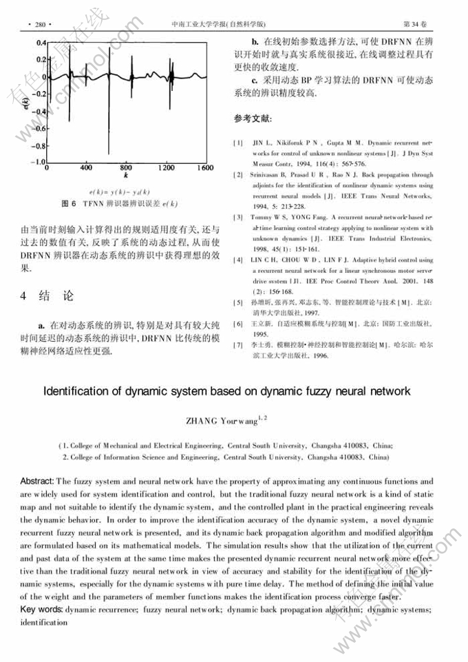 Key words:dynamic recurrence; fuzzy neural network; dynamic back propagation algorithm; dynamic systems;identification