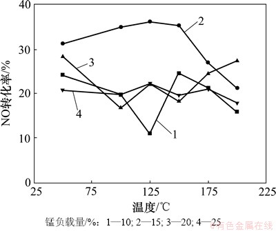 图6所示为不同锰负载量对催化剂低温催化氧化NO活性的影响。从图6可见:当锰负载量为15%时,其相应的催化剂NO转化率较高;当反应温度为150 ℃时,NO转化率达到最大值38.3%。张俊丰等[16]研究指出:Mn的负载量直接影响催化剂的比表面积及催化剂表面所能提供的活性位,Mn负载量大,多余的晶相可能覆盖住部分活性位,使催化剂的活性降低;反之,负载量小,导致活性组分少,也使催化剂的活性下降。本实验中,过低的锰添加量导致其在基体上沉积量少,形成的活性位不能满足NO催化氧化反应的需要;而当锰的添加量过高时,沉积物量较大,对基体的覆盖较彻底,使得基体上的活性位被覆盖,从而NO的转化率也逐渐降低。