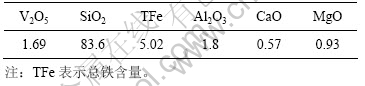 粘土钒矿是以SiO2(占矿石总质量80%左右)为基体的粘土质矿物,90%左右的钒赋存于粘土质伊利石的硅-氧四面体微晶结构中,另有8%左右的钒赋存于结晶程度很差的钒云母中,钒云母是该矿中惟一被发现的独立钒矿物。粘土钒矿石的化学成分及含量见表1。