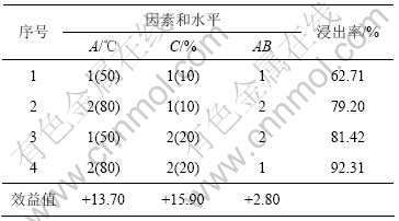 正交实验结果表明矿浆液固比、硫酸质量分数和温度对钒的浸出率有显著影响,其效益值r为正,矿浆液固比和硫酸质量分数的效益值均比温度效益值大,即矿浆液固比和硫酸质量分数影响力大于后者。