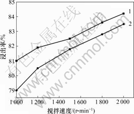 根据前面提到的一般多相浸出反应过程的速度控制规律,若确定该浸出过程中传质扩散是关键历程和决定步骤,需进行搅拌强度和相流动状态试验,考查液膜层厚度对反应的影响,结果如图1所示。