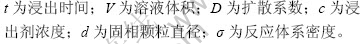 在固-液多相浸出反应中,当液膜扩散为控制步骤时,搅拌强度对浸出率影响非常大,通常可提高浸出率40%~70%。但从实验结果(图1)可知,搅拌强度对综合浸出率影响不大,影响程度为5%~10%,只体现出一般固相物系在液相中充分分散所产生的浸出率提高的效果。由此可以判断,浸出反应控制步骤非液膜扩散控制应是固膜扩散控制。实验中进行搅拌可加强两相流动状态,其主要作用一是使矿物质在液体中充分分散;二是适当降低传质边界层的厚度,加速传质过程。