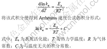 由图2可求出不同温度下浸出反应扩散速度系数ke,根据Arrhenius定理[10]: