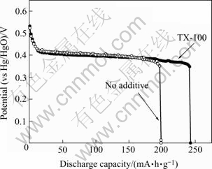 Fig.1 Effect of surfactant TX-100 on discharge curve of α-Ni(OH)2 electrode (c(Ni2+)=0.7 mol/L, pH≈8)