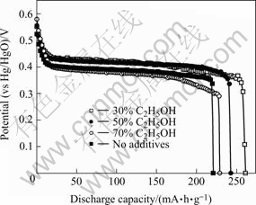 Fig.2 Effect of ethanol concentration on discharge curves for α-Ni(OH)2 (1% TX-100, pH≈8)