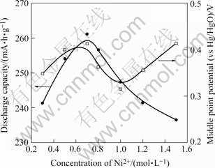 Fig.3 Effects of Ni2+ concentration on discharge capacity and discharge potential