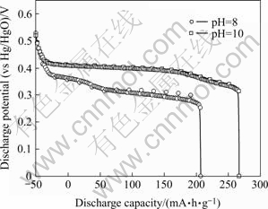 Fig.4 Discharge curves of α-Ni(OH)2 synthesized at different pH values (c(Ni2+)=0.7 mol/L, 30% ethanol solution)