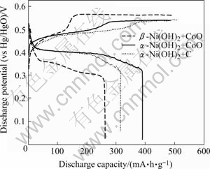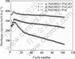 图5所示为优化条件下制备的α-Ni(OH)2和β-Ni(OH)2样品电极的充放电曲线。前面的电化学性能测试过程中,电极的添加剂均为石墨粉,本实验还比较了电极中添加5%CoO时的充放电性能。从图中可以看出,采用石墨添加剂时,α-Ni(OH)2电极的最高放电容量为320 mA·h/g;但采用CoO为添加剂时,制备的α-Ni(OH)2电极的放电容量可达到390 mA·h/g。同时Al取代α-Ni(OH)2的充电电压比β-Ni(OH)2低 50 mV左右,而平均放电电压比β-Ni(OH)2高100 mV左右。