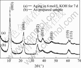 图8所示为优化条件下制备的Al代α-Ni(OH)2样品的XRD衍射图,表明本研究合成的样品具有典型的α-Ni(OH)2结构,其(003)晶面的晶间距为0.789 38 nm,与文献[14]的数据一致。XRD谱上未发现Al的衍射峰,同时结合文献[15]中的研究结果,说明 Al以固溶态存在于α-Ni(OH)2的晶格中。图中曲线2所示为α-Ni(OH)2在6 mol/L KOH溶液中老化7 d后的XRD谱,与曲线1的特征峰基本一致,表明本实验制备的Al取代α-Ni(OH)2在强碱介质中能稳定存在。