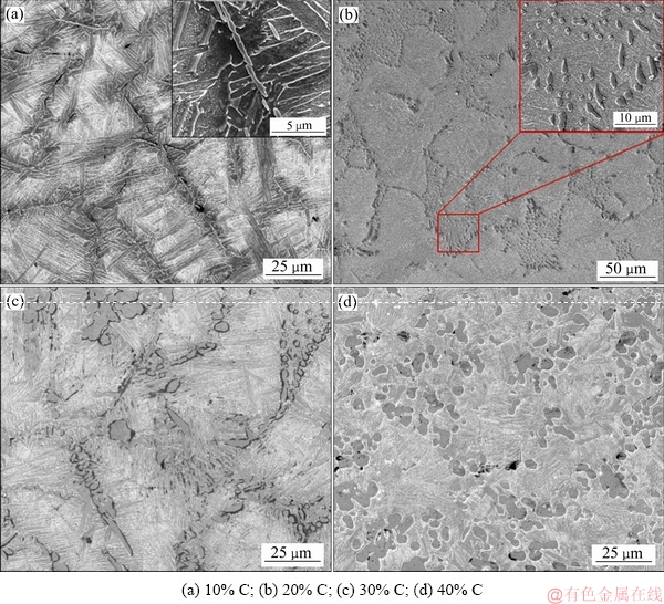 图6所示为不同石墨含量预置粉末在工艺2条件下获得的涂层截面SEM像。由图6可见,当C含量为10%时,涂层内TiC同样呈短纤维状,但其尺寸同工艺1条件下获得的涂层内增强体相比略有增大;当C含量为20%时,TiC形状和分布与相同成分下由工艺1制备的涂层相似,短纤维状TiC逐渐向等轴状转变,增强体尺寸略有增大,约为0.8~4.0 μm;当C含量增至30%时,等轴状增强体尺寸明显增大,且仍一部分沿晶界析出,一部分弥散分布在晶粒内,尺寸为2~10 μm;当C含量增至40%后,短纤维状增强体完全消失,TiC以等轴状和近似等轴状均匀分布。